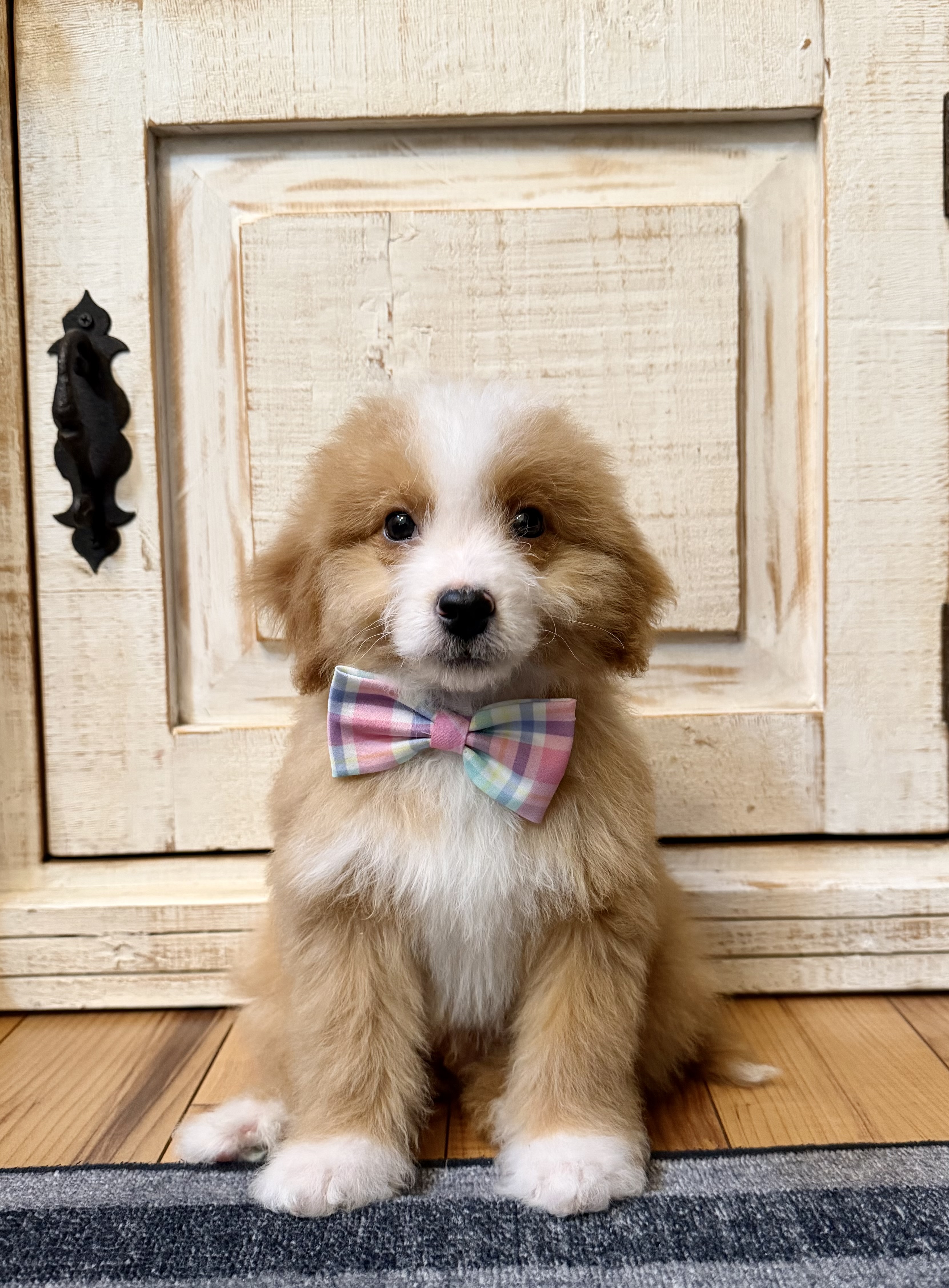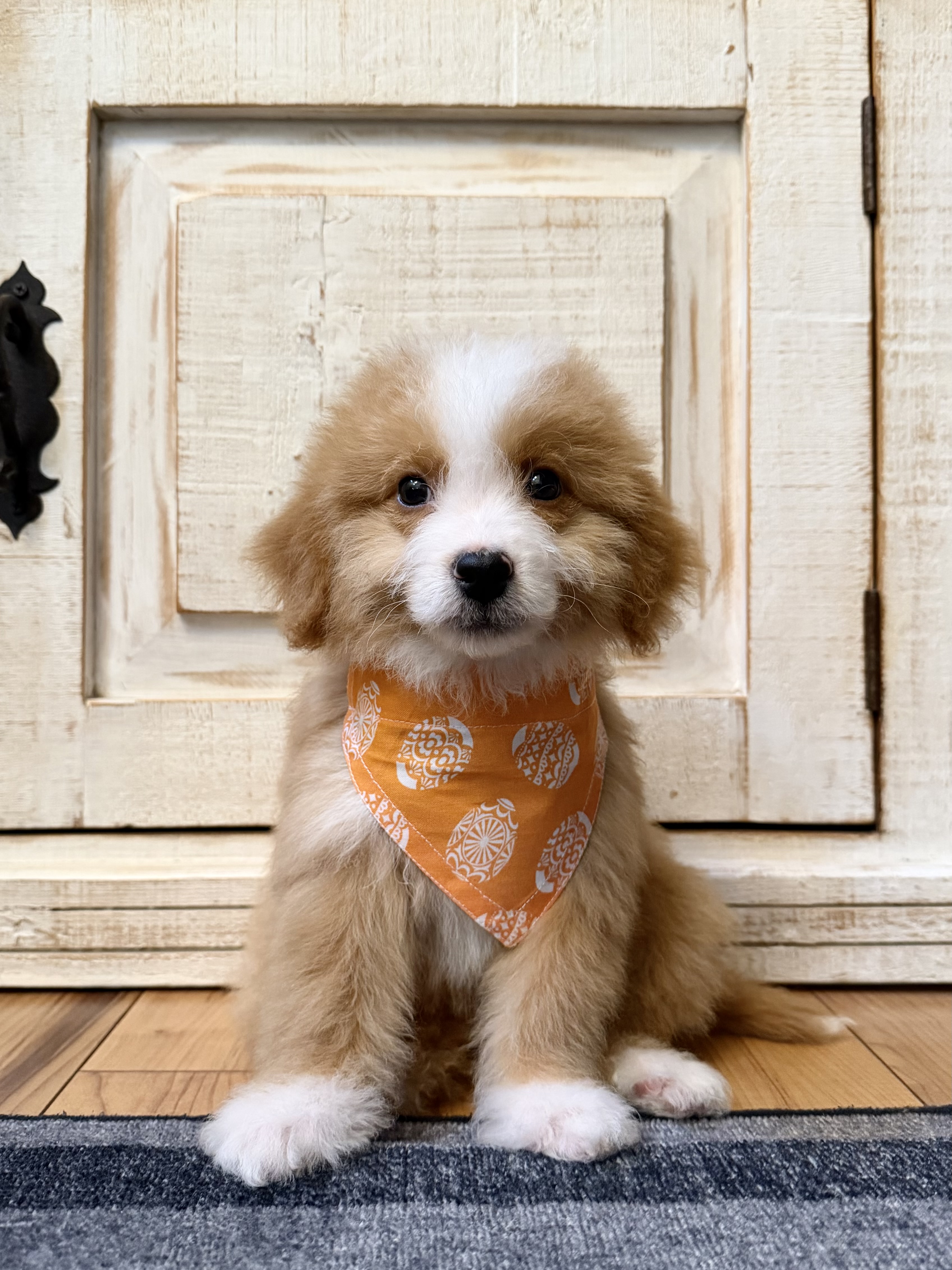 Red/White Bicolor male: 25lbs full grown, fully furnished wavy to curly coat, non-shedding